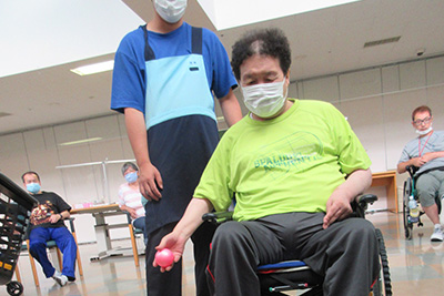 意欲的に参加する入園者も多く、生活の楽しみになっています。身体を動かすことでリハビリの役目も担っています。